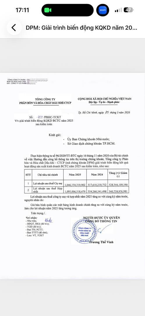 Tổng Công ty Phân bón và Hóa chất Dầu khí - Công ty Cổ phần giải trình biến động KQKD năm 2025 sau kiểm toán so với cùng kỳ năm trước