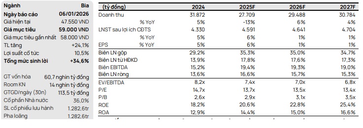 Sản lượng bia năm 2026 phục hồi từ mức nền thấp: Chúng tôi dự báo sản lượng bia tăng 5% YoY trong năm 2026, nhờ (1) hiệu ứng Tết Nguyên đán đến muộn giúp chuyển dịch sản lượng tiêu thụ sang quý 1/2026 và (2) gián đoạn tại kênh truyền thống (GT) giảm bớt sau khi SAB thay thế các điểm bán đã đóng cửa và các nhà phân phối GT thích nghi với các quy định thuế mới. Với Luật Thuế Thu nhập cá nhân (TNCN) và Thuế Giá trị gia tăng (GTGT) sửa đổi vừa được Quốc hội thông qua ngày 10/12/2025, chúng tôi kỳ vọng rằng triển vọng 2026 sẽ khả quan hơn so với các quý trước.