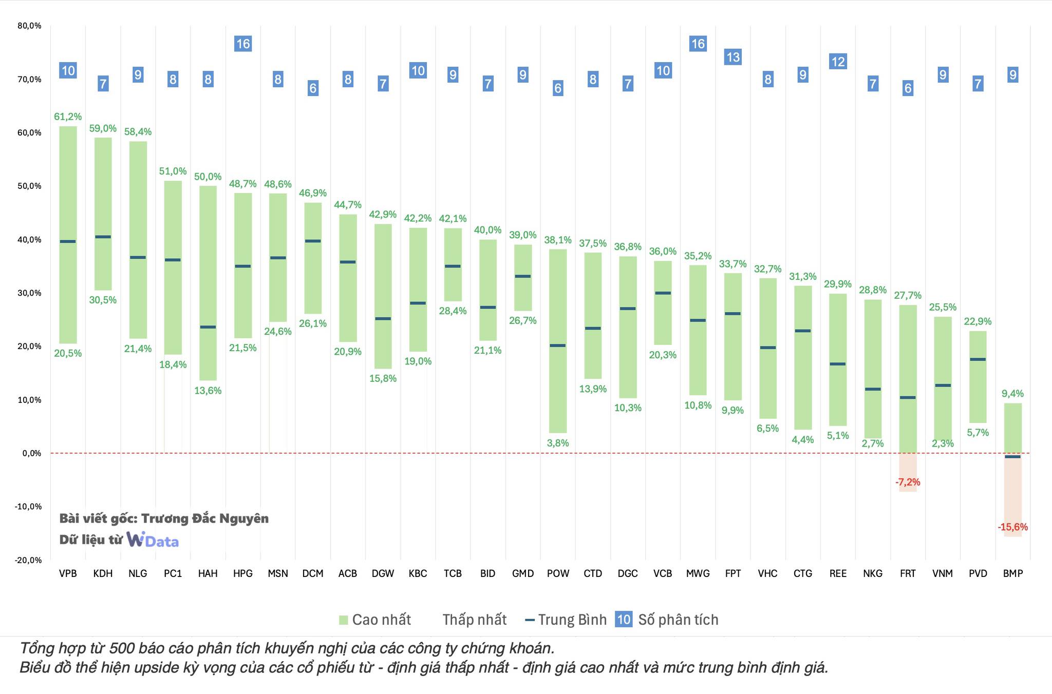 - Mỗi cột thể hiện khoảng upside dựa trên giá mục tiêu của các công ty chứng khoán so với giá thị trường hiện tại.