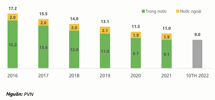 Sản lượng khai thác dầu thô ở Việt Nam (triệu tấn)