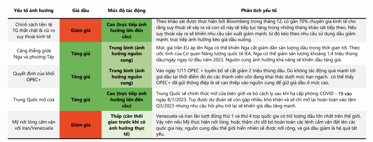 - Diễn biến giá dầu thế giới dự kiến sẽ ít biến động hơn hơn so với năm 2022, giúp giảm thiểu rủi ro đánh giá lại hàng tồn kho.
