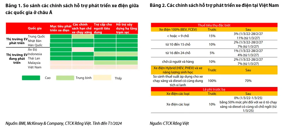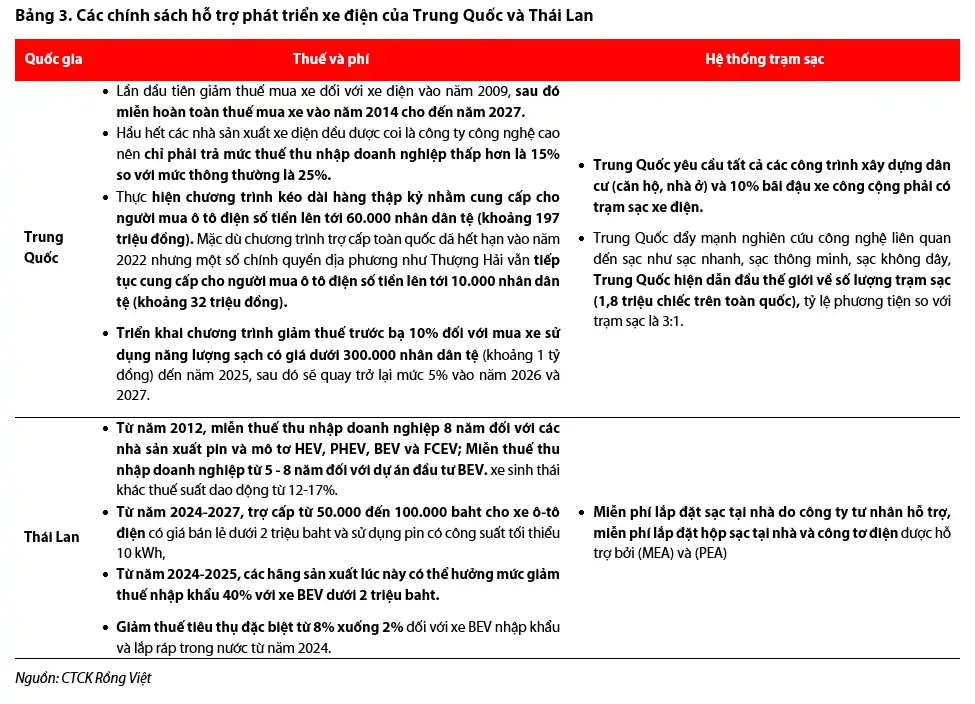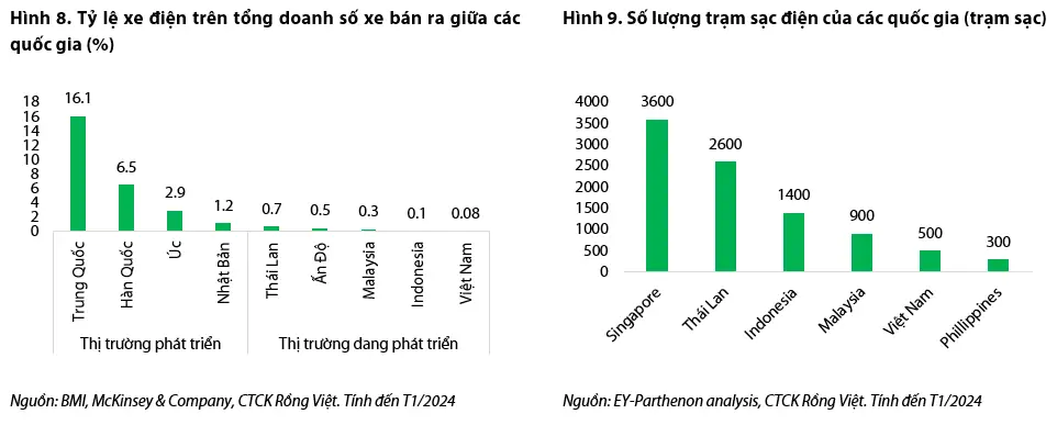 Tuy nhiên, VN chỉ thực hiện một số ít chính sách nhằm hỗ trợ người tiêu dùng xe điện thông qua việc giảm thuế tiêu thụ đặc biệt và phí trước bạ (Bảng 2). Những biện pháp này không hiệu quả so với các biện pháp khuyến khích toàn diện được ghi nhận ở các quốc gia khác như Trung Quốc và Thái Lan (Bảng 1, 3). Các quốc gia này cung cấp các khoản trợ cấp cho việc mua ô tô, chi phí sạc điện, lắp đặt ổ cắm sạc cá nhân cũng như miễn hoặc giảm thuế trước bạ, thuế phí cầu đường, thuế giá trị gia tăng và thuế thu nhập doanh nghiệp. Hơn nữa, họ đang tích cực đầu tư vào phát triển cơ sở hạ tầng trạm sạc xe điện (Hình 8). Do đó, chúng tôi tin rằng còn quá sớm để dự đoán xe điện sẽ trở thành chất xúc tác then chốt cho cổ phiếu ô tô (như HAX, CTF).
