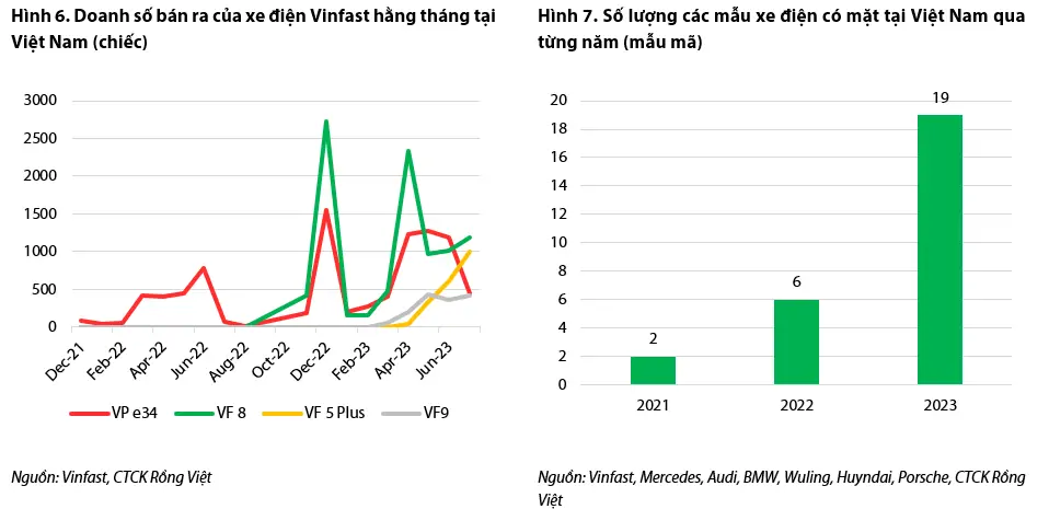 Theo Bộ GTVT VN, tổng số lượng xe điện và xe hybrid được đăng kiểm tại Việt Nam lần lượt đạt 28.000 và 3.557 chiếc vào năm 2023, tăng đáng kể so với mức chỉ 167 chiếc vào năm 2021. Hơn nữa, sự tăng trưởng tích cực của Vinfast (Hình 6) và sự ra đời của nhiều mẫu Xe điện (EV) từ các thương hiệu khác (Hình 7) cho thấy sức hấp dẫn ngày càng tăng của xe điện đối với cả các thương hiệu ô tô và người tiêu dùng trong nước.