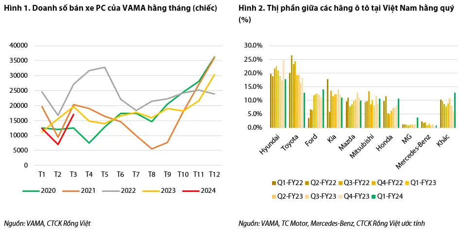 Theo VAMA, trong 3T-2024, doanh số bán ô tô tăng -21,5% YoY do (1) nhu cầu gần như đổ dồn vào H2-2023 – giai đoạn có hiệu lực của quyết định cắt giảm 50% lệ phí trước bạ ô tô (Hình 1), ( 2) tâm lý người tiêu dùng vẫn trì trệ (Hình 3). Đáng chú ý, trong bối cảnh sức mua yếu, các thương hiệu ô tô nỗ lực vượt khó bằng cách chiếm thêm thị phần, dẫn đến cạnh tranh khốc liệt hơn từ năm 2023 cho đến Q1-2024. Cụ thể, các doanh nghiệp sản xuất hàng đầu như Toyota, Huyndai sụt giảm thị phần trong khi các doanh nghiệp nhỏ hơn như Ford, Kia, Mazda, Mitsubishi, MG lại ghi nhận tăng trưởng (Hình 2). Do đó, doanh thu thuần Q1-2024 của các đại lý ô tô sẽ phân hóa dựa trên thương hiệu ô tô được họ phân phối.