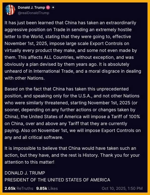 Bắt đầu từ ngày 1 tháng 11 năm 2025 (hoặc sớm hơn, tùy theo hành động tiếp theo của Trung Quốc), Hoa Kỳ sẽ áp đặt mức thuế quan 100% đối với Trung Quốc, ngoài các mức thuế mà họ đang phải chịu hiện nay.