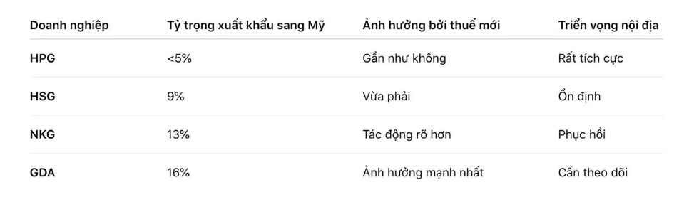 Với tỷ trọng xuất khẩu của các doanh nghiệp thì việc bị áp thuế cao sẽ buộc các doanh nghiệp phải hạ giá bán trên thị trường Mỹ, điều này sẽ làm giảm biên lợi nhuận gộp. Tuy nhiên, đối với các doanh nghiệp có tỷ trọng xuất khẩu thấp như HPG, HSG thì hầu như ít bị ảnh hưởng với thông tin thuế quan này.