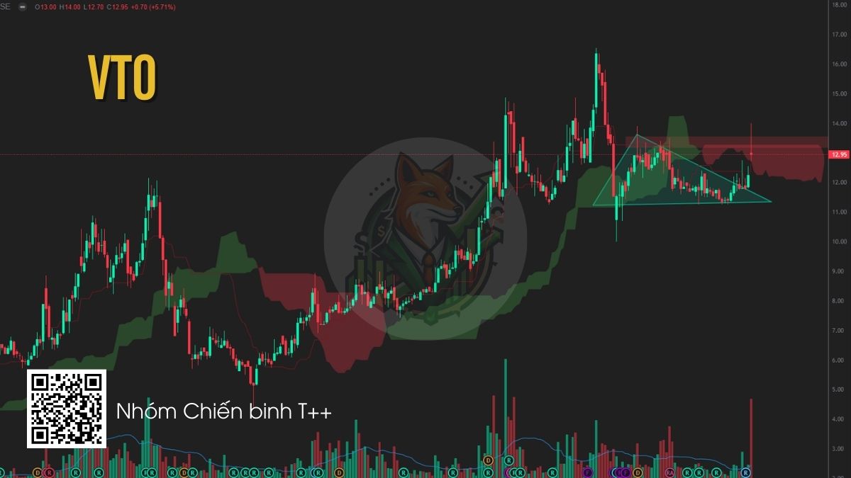VTO vừa breakout khỏi mô hình tam giác tích lũy với nến tăng mạnh kèm khối lượng đột biến, cho thấy dòng tiền bắt đầu quay lại cổ phiếu. Trong bối cảnh căng thẳng địa chính trị khiến giá cước vận tải dầu tăng, nhóm vận tải biển đang được hưởng lợi. Sau cú breakout này, giá có thể retest vùng 11.8–12.3; nhà đầu tư có thể cân nhắc giải ngân tại vùng này.