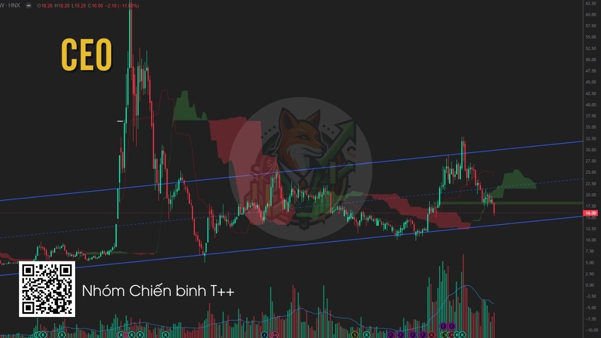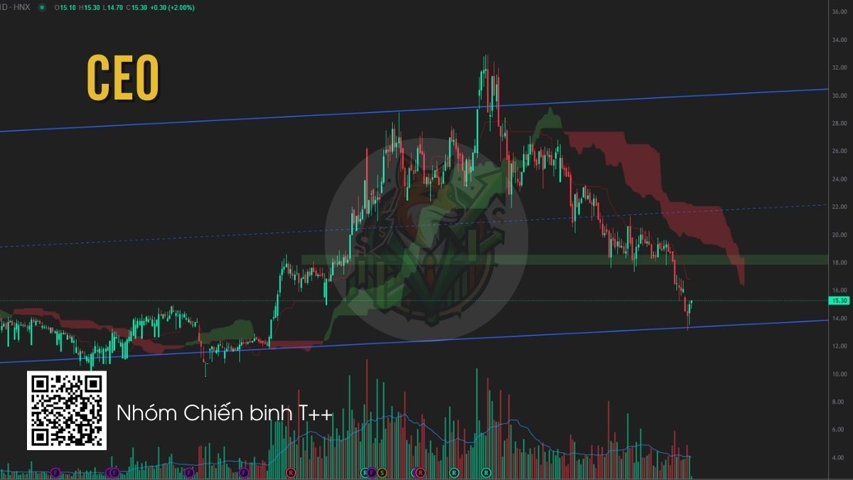CEO đang điều chỉnh về vùng hỗ trợ quan trọng 14–15, khu vực trùng với đáy gần nhất và biên dưới của kênh xu hướng tăng trung hạn. Nhà đầu tư có thể theo dõi phản ứng giá tại vùng này và cân nhắc giải ngân khi xuất hiện tín hiệu nến đảo chiều kèm khối lượng cải thiện. Nếu vùng hỗ trợ được giữ vững, cổ phiếu có khả năng phục hồi về vùng 18–22 trong các nhịp tăng tiếp theo.