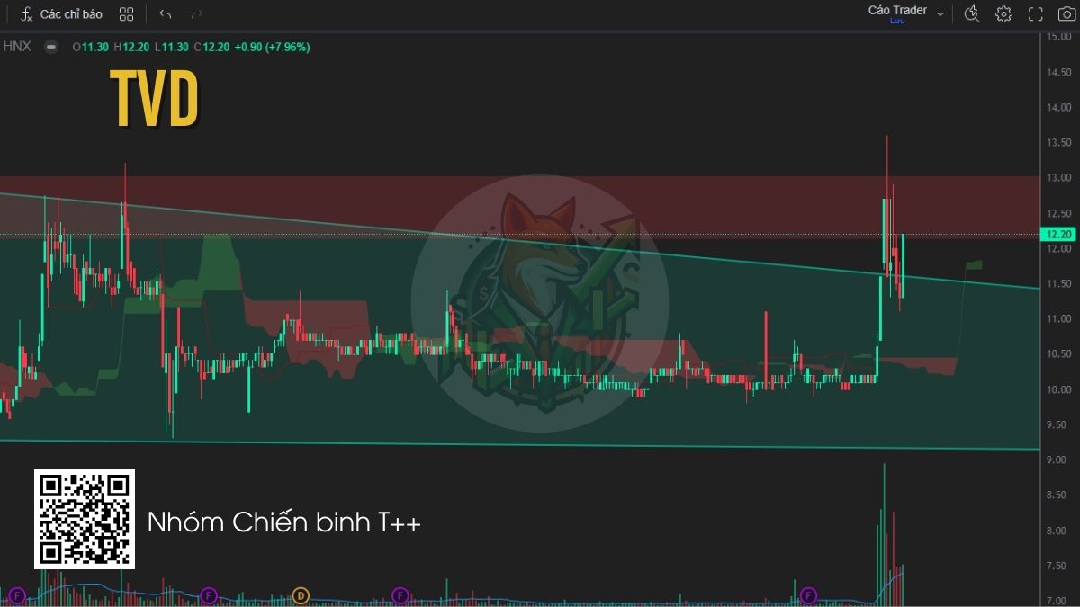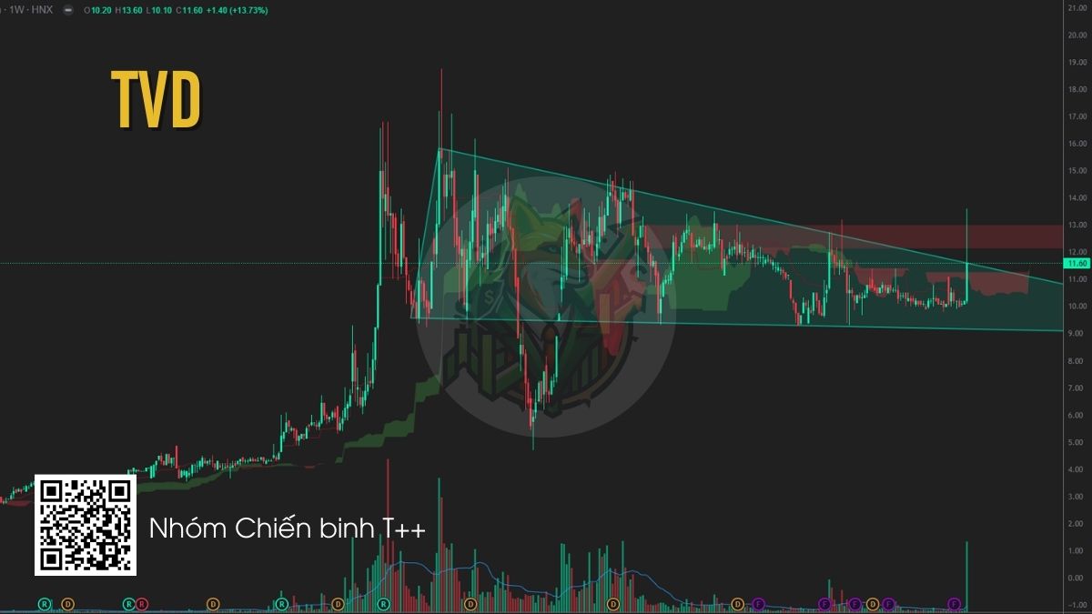 TVD đang breakout khỏi mô hình tam giác tích lũy kéo dài, với nến tuần tăng mạnh kèm khối lượng đột biến, cho thấy dòng tiền bắt đầu quay lại cổ phiếu. Trong bối cảnh nhóm ngành than được hỗ trợ bởi nhu cầu năng lượng và kế hoạch tăng sản lượng của TKV, xu hướng tăng của TVD có thể tiếp tục nếu giá giữ được vùng breakout. Nhà đầu tư có thể cân nhắc giải ngân khi giá retest vùng 10.8–11.2.