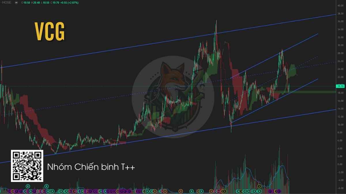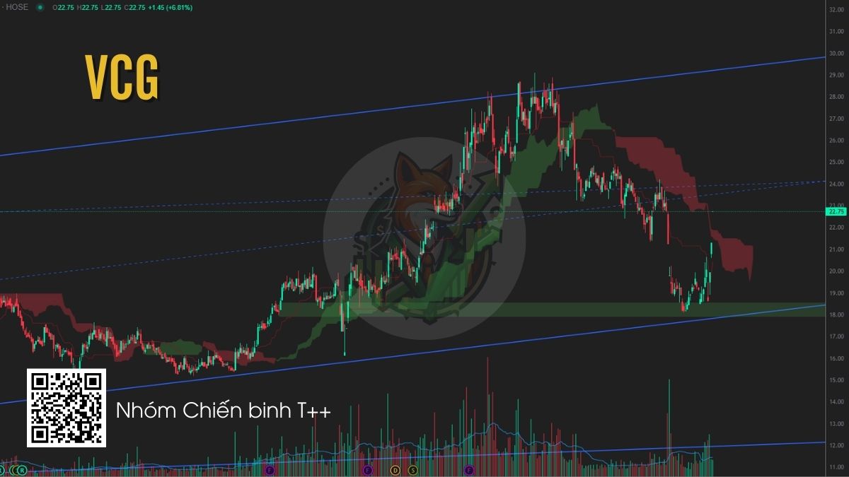 VCG đang giao dịch quanh vùng hỗ trợ 18–20, trùng với biên dưới của kênh xu hướng tăng dài hạn. Sau nhịp điều chỉnh mạnh từ vùng 28, giá xuất hiện nến tín hiệu kèm khối lượng tăng, cho thấy lực cầu bắt đầu tham gia tại vùng hỗ trợ nhà đầu tư có thể cân nhắc giải ngân từng phần tại vùng giá này.
