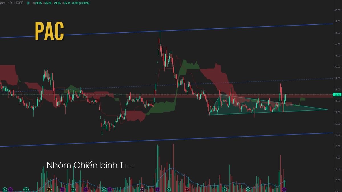 PAC đang hình thành mô hình tam giác tích lũy sau nhịp điều chỉnh mạnh, với khối lượng giao dịch gần đây cải thiện cho thấy dòng tiền bắt đầu quay lại cổ phiếu. Về cơ bản, doanh nghiệp hưởng lợi từ nhu cầu pin lưu trữ năng lượng và việc cung cấp ắc quy cho VinFast, giúp triển vọng ngành tích cực, nhà đầu tư canh nhịp điều chỉnh về vùng giá 22.8–23 để giải ngân.