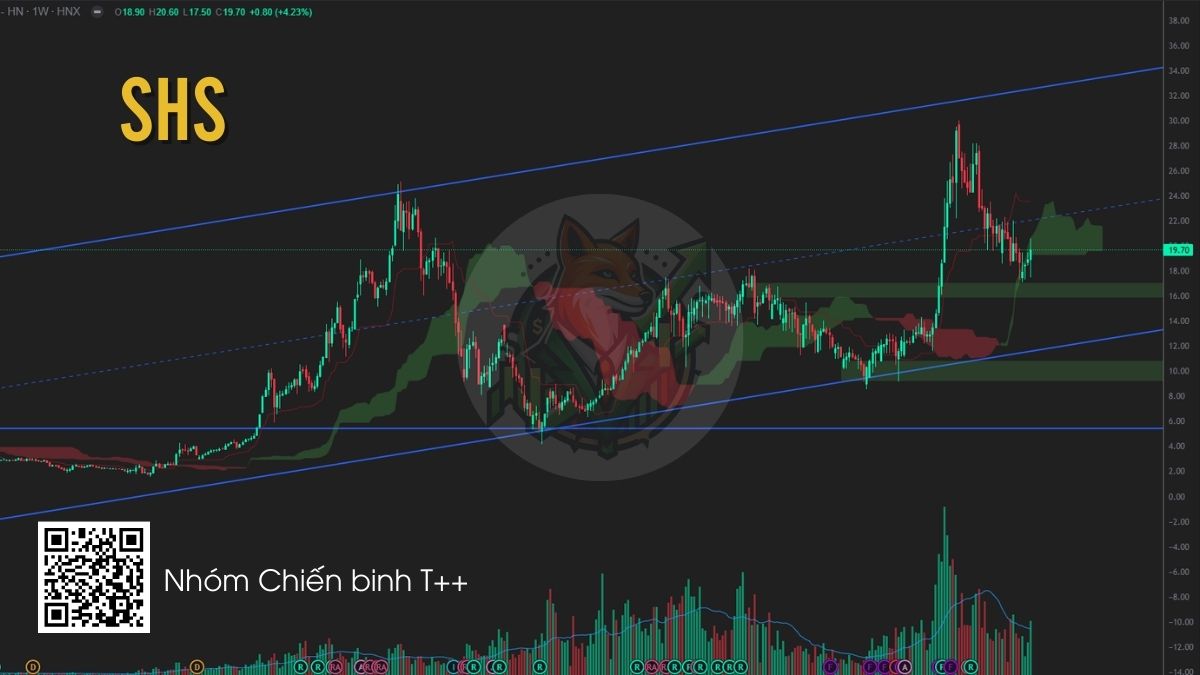 SHS đang điều chỉnh về vùng hỗ trợ mạnh 18–19 sau nhịp tăng nóng trước đó. Tại khu vực này xuất hiện nến rút chân kèm khối lượng cải thiện, cho thấy lực cầu đang hấp thụ quanh vùng hỗ trợ. Bên cạnh đó, nhóm chứng khoán được hưởng lợi từ câu chuyện nâng hạng thị trường, tạo kỳ vọng dòng tiền quay lại ngành, nhà đầu tư có thể cân nhắc giải ngân quanh vùng 18.5–19.5.