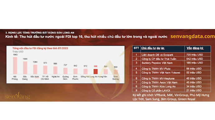 Top 10 tỉnh thu hút FDI trong 8 tháng/2023. Tại phía Nam, Long An đạt 588 triệu USD, chỉ đứng sau TPHCM và cao hơn Bình Dương.