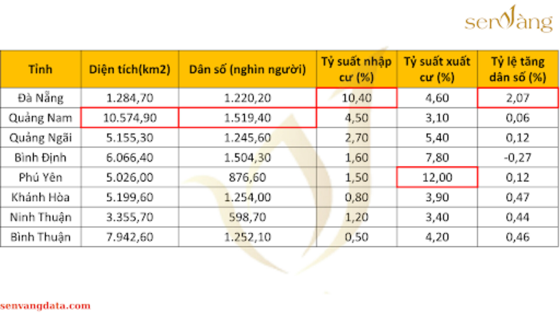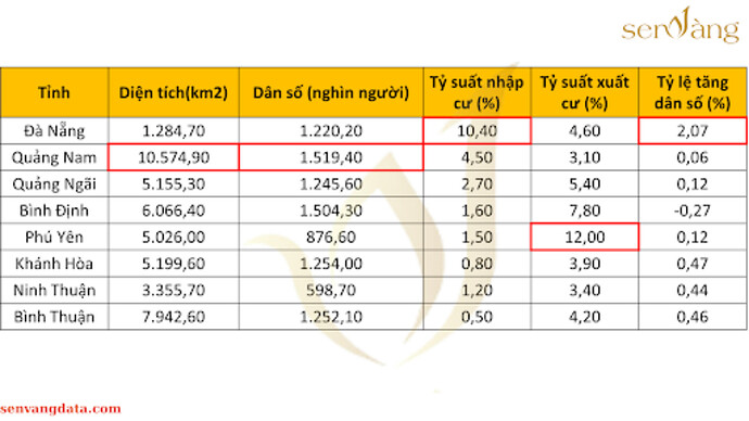 - Mật độ dân số của Đà Nẵng cao nhất trong các tỉnh lân cận và cao gấp hơn 3 lần mật độ dân số trung bình cả nước năm 2022. Đà Nẵng thu hút nhiều người di cư từ các tỉnh thành khác đến để tìm kiếm việc làm và cơ hội học tập tốt hơn. Tỷ suất nhập cư của Đà Nẵng là 10,4% năm 2022 cao nhất trong các tỉnh lân cận được so sánh, điều này có thể thấy Đà Nẵng đang thu hút dân cư, nguồn lao động rất mạnh và ngày càng phát triển
