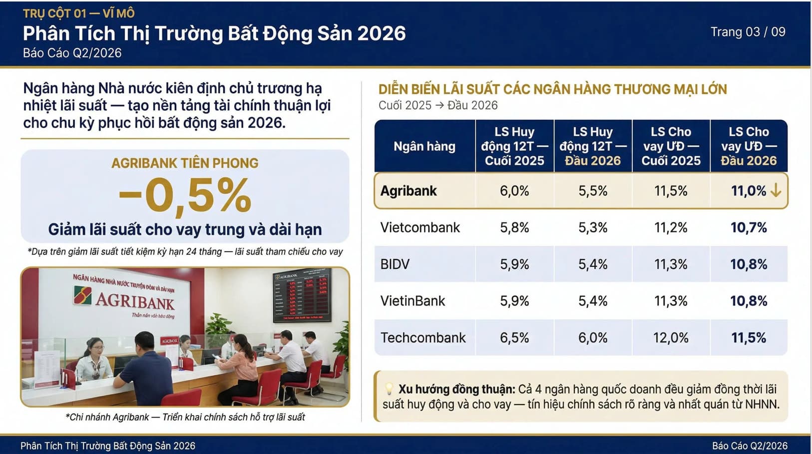 Ngân hàng Nhà nước kiên định chủ trương hạ nhiệt lãi suất nhằm hỗ trợ tín dụng. Cụ thể, Agribank tiên phong giảm khoảng 0,5% lãi suất cho vay trung và dài hạn, phản ánh xu hướng nới lỏng chính sách rõ rệt. Đồng thời, dữ liệu từ các ngân hàng lớn như Vietcombank, BIDV, VietinBank và Techcombank cho thấy cả lãi suất huy động kỳ hạn 12 tháng và lãi suất cho vay ưu đãi đều đồng loạt giảm từ cuối 2025 sang đầu 2026 (khoảng 0,5 điểm %), qua đó giúp chi phí vốn hạ xuống.