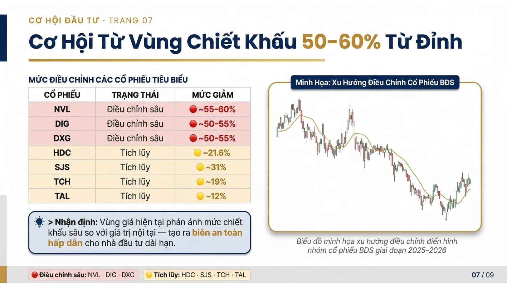 Diễn biến này cho thấy mặt bằng giá hiện tại đã phản ánh phần lớn rủi ro và tạo ra “biên an toàn” tương đối hấp dẫn cho nhà đầu tư dài hạn, đặc biệt trong bối cảnh thị trường bất động sản được kỳ vọng phục hồi giai đoạn 2025–2026.