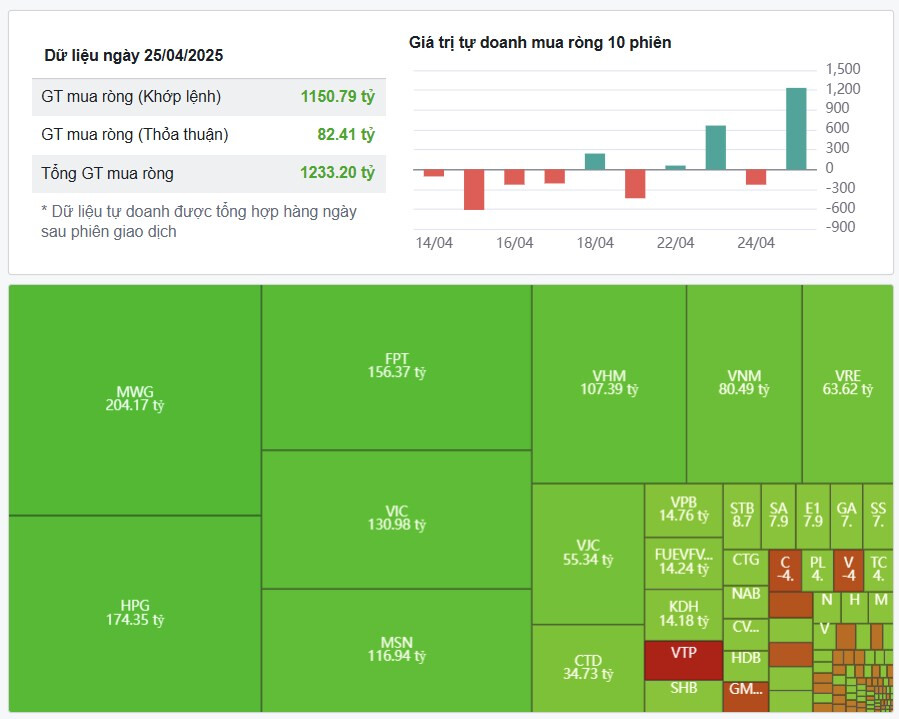 Dòng tiền tự doanh chú ý tích cực với lực mua ròng cuối tuần rất mạnh, cụ thể mua hơn 1.233 tỷ, mua rất mạnh những cổ phiếu: MWG, HPG, FPT, VIC, MSN, VHM, VNM,…
