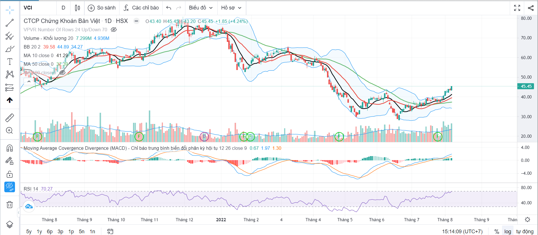 VCI đã kết thúc tuần giao dịch với mức tăng điểm tốt vượt đường trung bình 20 tuần, khối lượng giao dịch trên mức trung bình 20 ngày. Chỉ báo MACD đã cho tín hiệu mua mạnh bên trên ngưỡng 0. Cùng với đó, giá đã liên tục bám cận trên của Boolinger Band cho thấy xu hướng tăng tích cực.