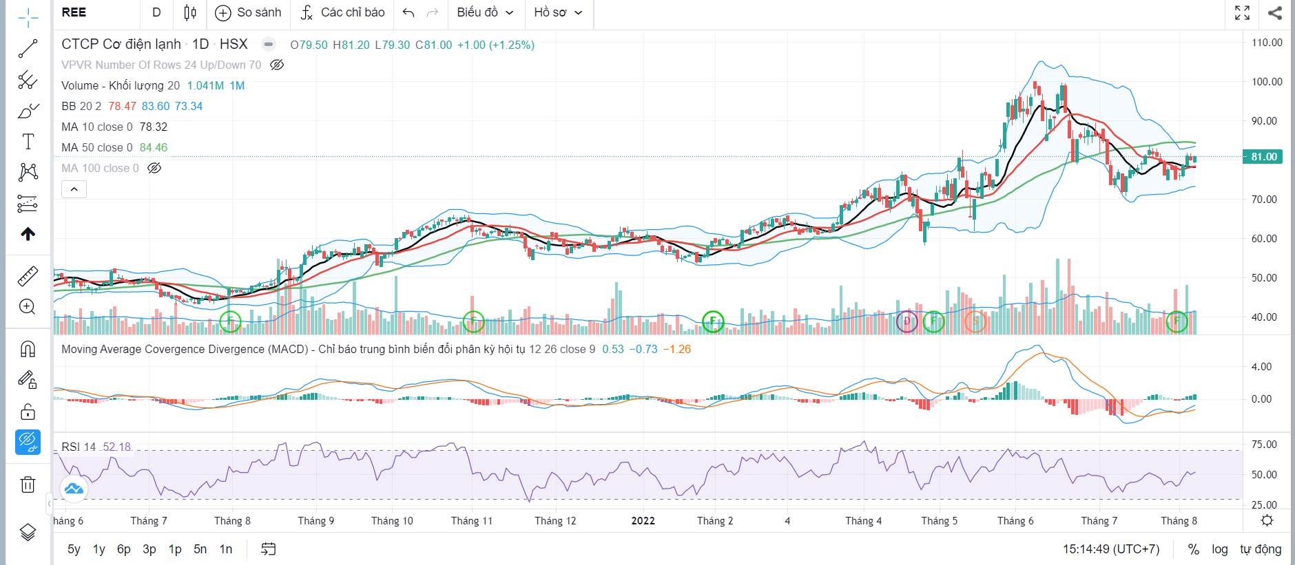 Kết thúc tuần giao dịch, đồ thị tuần của REE đã xuất hiện mẫu hình đảo chiều, cây nến tuần này đã cover hết cây nến giảm tuần trước đi kèm với khối lượng cao hơn. Đối với đồ thị ngày, đã xuất hiện đáy sau cao hơn đáy trước, được ủng hộ bởi 2 chỉ bảo RSI và MACD; cổ phiếu sẵn sàng cho việc chinh phục vùng đỉnh trước 82 và tiếp tục sóng hồi.