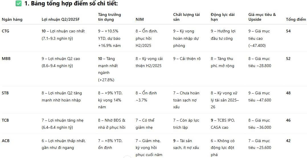 | SSI | CTG (VietinBank) | - LNST Q2/2025F: 9.300 tỷ đồng (+38% YoY, +36% QoQ) |