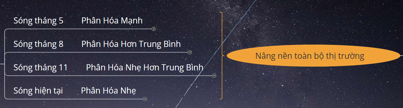 Đặc biệt quan sát vào nhóm cổ phiếu yếu hơn thị trường chung qua mỗi con sóng phục hồi trong biên độ 1200-1300 đã có nhiều chuyển biến tích cực và dần dần sự phân hóa trên thị trường giảm dần và cho đến hiện tại mức phân hóa còn khá nhẹ khi mà rõ ràng trong nhịp tăng giá này chúng ta có nhiều cổ phiếu yếu hơn thị trường trước đó tăng mạnh quan trọng là tạo ra nhiều cơ hội đầu tư so với các nhịp trước đó (Cụ thể chi tiết từng sóng sẽ phân tích trong video)
