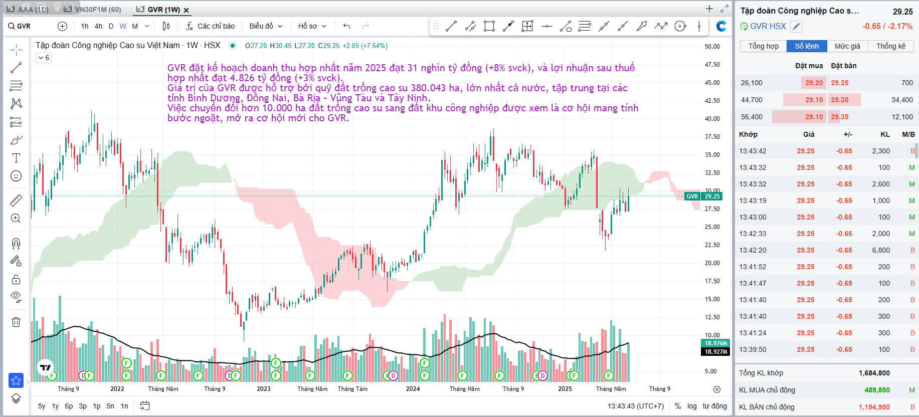 GVR đặt kế hoạch doanh thu hợp nhất năm 2025 đạt 31 nghìn tỷ đồng (+8% svck), và lợi nhuận sau thuế hợp nhất đạt 4.826 tỷ đồng (+3% svck).