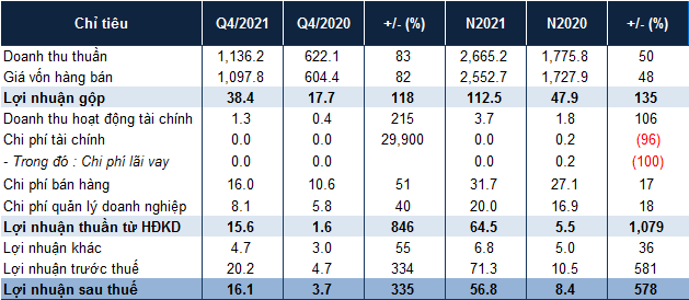 Doanh thu thuần quý 4/2021 của PSW đạt 1,136 tỷ đồng, tăng 83% so cùng kỳ. Lợi nhuận gộp ở mức 38 tỷ đồng, gấp 2.2 lần.