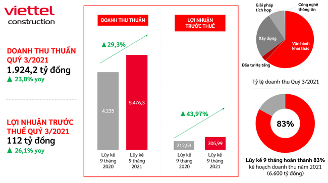 Lũy kế 9 tháng, Viettel Construction ghi nhận doanh thu đạt 5.476,3 tỷ đồng, tăng trưởng 29,3% so với cùng kỳ, hoàn thành 83% kế hoạch. Lợi nhuận trước thuế đạt 306 tỷ đồng, tăng trưởng gần 44% so với cùng kỳ và hoàn thành 87% mục tiêu lợi nhuận cả năm đề ra.