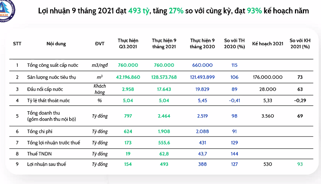 Lũy kế 9 tháng, doanh thu 1.385,6 tỷ đồng, tăng 12,6% và thực hiện 82% kế hoạch năm. Lợi nhuận trước thuế 358 tỷ đồng, tăng 48,3% và vượt 7% kế hoạch năm.