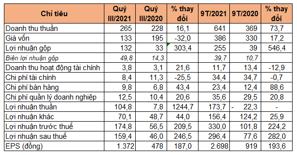 Lũy kế 9 tháng, doanh thu hoạt động tăng 83%, lợi nhuận trước thuế gấp 3,4 lần lên 177 tỷ đồng.