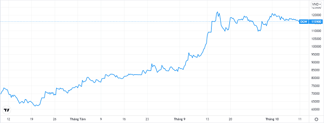 Cổ phiếu DGW chốt phiên ngày 9/10 ở 115.900 đồng/cp, tăng 88% trong vòng gần 3 tháng qua.