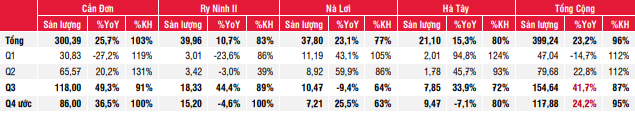 Mục tiêu sản lượng quý cuối năm được đặt ở mức 124,5 triệu kWh, tương ứng tăng 31,2% so với cùng kỳ. Kế hoạch này có thể đạt được dựa trên diễn biến thuỷ văn thuận lợi ở khu vực phía Nam và theo trao đổi của SSI Research với công ty. Giả định công ty có thể hoàn thành 95% kế hoạch quý IV, sản lượng ước tính có thể đạt 117,8 triệu kWh, tăng 24,2% so với cùng kỳ.