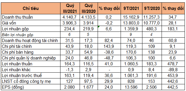Doanh thu tài chính tăng 82,4% lên 31,5 tỷ đồng, chi phí tài chính cũng tăng 144% lên 44 tỷ đồng. Chi phí bán hàng giảm 39% và chi phí quản lý giảm 49%. Nhờ vậy, lợi nhuận sau thuế cổ đông công ty mẹ đạt 127 tỷ đồng, tăng 30% so với cùng kỳ năm trước. So với mức kỷ lục ghi nhận trong quý III, lãi ròng quý này chỉ bằng 25%.