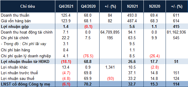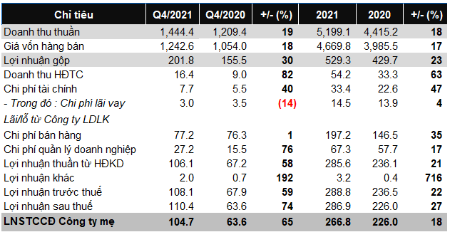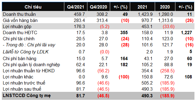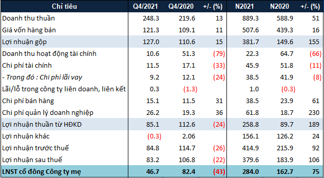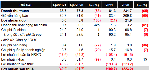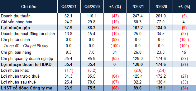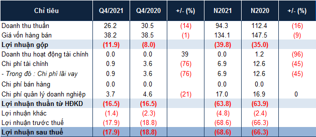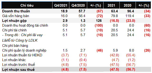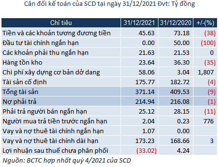Nợ phải trả tính đến cuối năm 2021 giảm 13% so đầu năm, còn gần 104 tỷ đồng, chủ yếu do dư nợ vay ngắn hạn giảm 21%, còn hơn 33 tỷ đồng