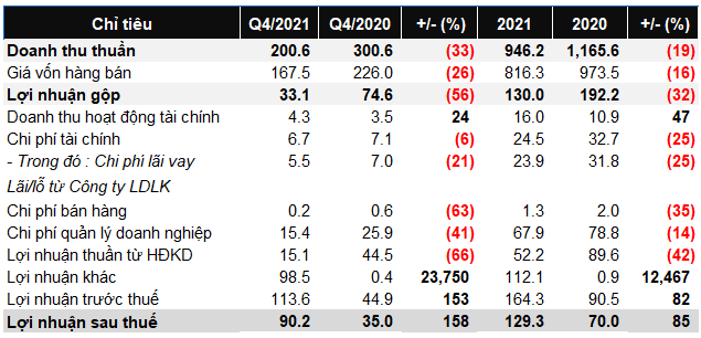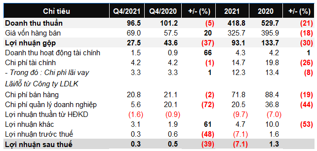 Trong năm 2021, doanh nghiệp bánh phồng tôm ghi nhận doanh thu giảm 14% cộng thêm chi phí bán hàng tăng nên lợi nhuận ròng giảm 41% so với năm trước, còn gần 55 tỷ đồng.