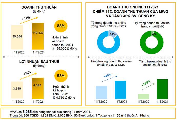 Số liệu kinh doanh 11 tháng 2021 của MWG cho hay, tuy chuỗi Thế giới Di động và Điện máy Xanh (ĐMX) đóng góp chính trong tổng doanh thu nhưng mức tăng trưởng không cao, chỉ 5% so với cùng kỳ. Trong khi đó, mục tiêu tăng trưởng hàng năm của MWG là hai con số. Điển hình, MWG dự tính trình cổ đông kế hoạch doanh thu năm 2022 là 140,000 tỷ đồng còn lợi nhuận sau thuế là 6,350 tỷ đồng, tương đương mức tăng 12% về doanh thu và 34% về lợi nhuận sau thuế so với kế hoạch 2021. Vì thế, MWG phải liên tục tìm kiếm các động lực tăng trưởng mới