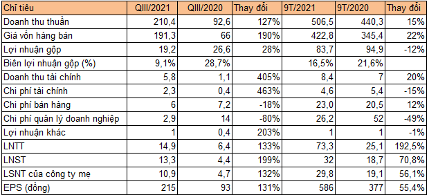Doanh thu tăng 127%, lợi nhuận sau thuế gấp 3 lần đạt 13,3 tỷ đồng trong quý III.