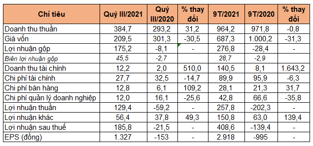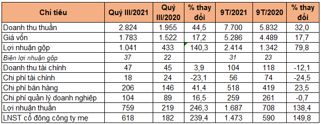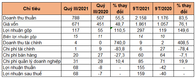 Riêng quý III, doanh nghiệp đạt doanh thu 4.127 tỷ đồng doanh thu, tăng 71%; lợi nhuận 760 tỷ đồng, cùng kỳ năm trước báo lỗ gần 30 tỷ đồng.