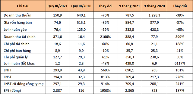 Luỹ kế 9 tháng, doanh thu thuần đạt 787,5 tỷ đồng, giảm 39% cùng kỳ. LNST cổ đông công ty mẹ đạt 709 tỷ đồng, tăng 241% cùng kỳ. Theo đó, công ty thực hiện 16% kế hoạch doanh thu và 62% kế hoạch lợi nhuận năm.