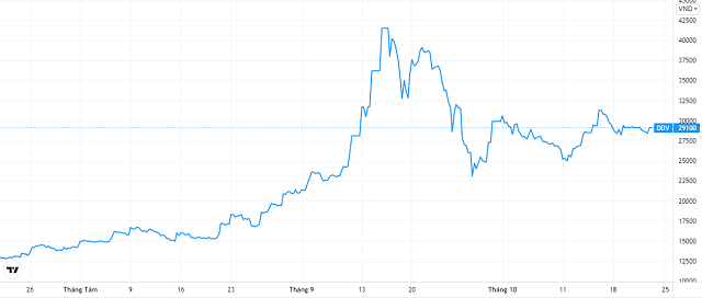 Cổ phiếu DDV có đà tăng nóng từ vùng 15.000 đồng/cp lên 41.000 đồng/cp trong nửa cuối tháng 8 đến 15/9, sau đó lao dốc về 29.100 đồng/cp.