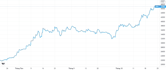 Trước diễn biến giá phân bón và kết quả kinh doanh tăng cao, cổ phiếu DPM tăng từ vùng 21.000 đồng/cp lên 47.000 đồng/cp trong vòng 2 tháng qua.