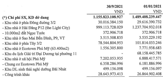 Hàng tồn kho tính đến cuối kỳ gần 1.273 tỷ đồng, giảm 21% so với đầu năm. Nguyên nhân giảm đến từ giảm chi phí sản xuất kinh doanh dở dang ở các dự án đang triển khai, giảm 22% còn gần 1.156 tỷ đồng, giảm 22%. Chi phí này có nhiều nhất ở dự án Khu nhà ở Hải Đăng P12 (The Light City).