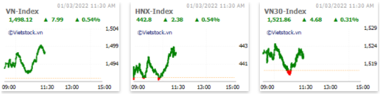 Các chỉ số thị trường cùng tăng điểm trong phiên ngày 01/03/2022. Cụ thể, chỉ số VN-Index tăng 0.58%, lên mức 1,498.78 điểm, HNX-Index tăng 0.71%, lên mức 443.56 điểm.