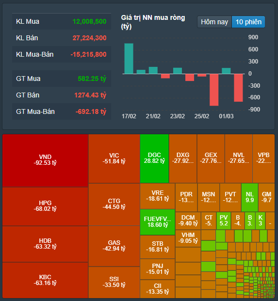 Khối tự doanh bán ròng trở lại 404 tỷ đồng ở sàn HoSE trong tháng 2.Khối tự doanh bán ròng rất mạnh chứng chỉ quỹ ETF nội FUEVFVND với 452 tỷ đồng.Các mã MSN, VHM, VIC, MWG, VRE… đều bị bán ròng mạnh.TCB được khối tự doanh mua ròng mạnh nhất với 314 tỷ đồng.