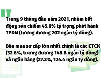 Báo cáo thị trường TPDN quý 3/2021 của SSI chỉ ra, nhóm bất động sản chiếm 45.6% tỷ trọng phát hành TPDN trong 9 tháng đầu năm 2021 (tương đương 202 ngàn tỷ đồng). Bên mua sơ cấp lớn nhất chính là các CTCK (32.6%, tương đương 148.8 ngàn tỷ đồng) và ngân hàng (27.3%, 124.4 ngàn tỷ đồng). Phải chăng mục tiêu thực sự của các thương vụ mua lại CTCK là mở thêm cửa cấp tín dụng bất động sản?
