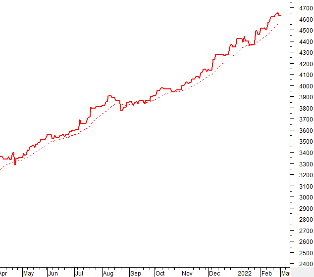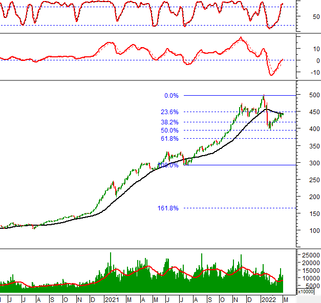 Trong phiên giao dịch ngày 01/03/2022, HNX-Index tiếp tục tăng điểm và tiến sâu vào vùng kháng cự 440-450 điểm (tương đương ngưỡng Fibonacci Retracement 23.6%).
