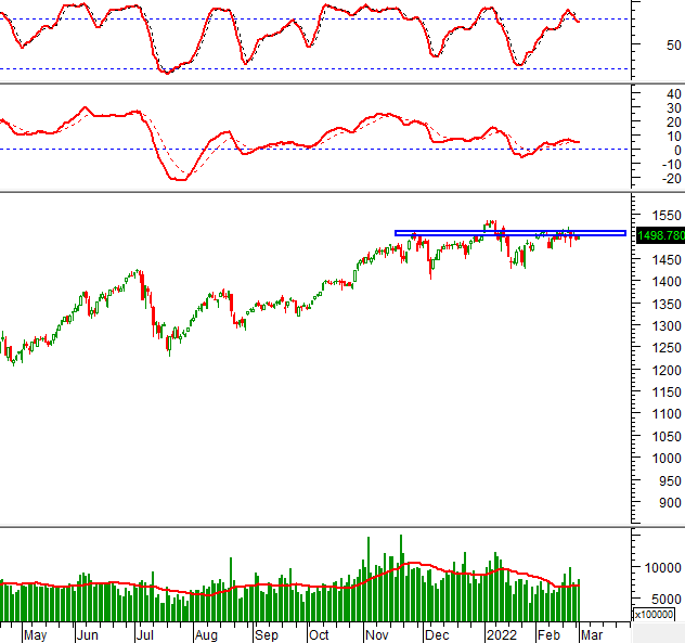 Trong phiên giao dịch ngày 01/03/2022, VN-Index vẫn lặp lại kịch bản cũ với quá trình tăng giảm đan xen nhau cực kỳ khó chịu khi test vùng 1,500-1,510 điểm (tương đương đỉnh cũ tháng 11/2021).
