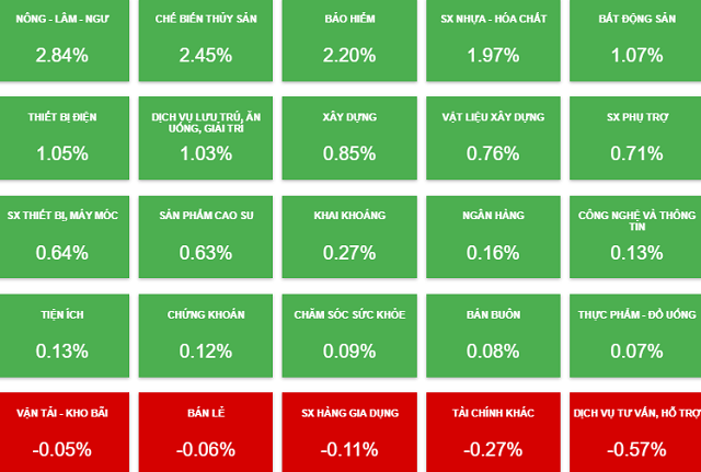 Nông - lâm - ngư đang là ngành tăng mạnh nhất thị trường với mức tăng 2.84%. Ngược lại, dịch vụ tư vấn, hỗ trợ là ngành giảm mạnh nhất với mức giảm 0.57%.