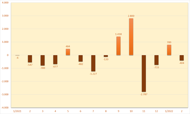 Cùng chiều với tự doanh CTCK, khối ngoại cũng bán ròng trong tháng 2. Riêng tại sàn HoSE, khối ngoại có tháng bán ròng thứ 7 liên tiếp với giá trị giảm 89% so với tháng 1 và ở mức hơn 338 tỷ đồng. Như vậy dòng vốn ngoại sàn này đã bán ròng tổng cộng 36.158 tỷ đồng trong 7 tháng qua.