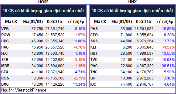 Kết thúc phiên giao dịch ngày 1/3, VN-Index tăng 8,65 điểm (0,58%) lên 1.498,78 điểm. HNX-Index tăng 3,14 điểm (0,71%) lên 443,56 điểm. UPCoM-Index tăng 0,18 điểm (0,16%) lên 112,38 điểm.